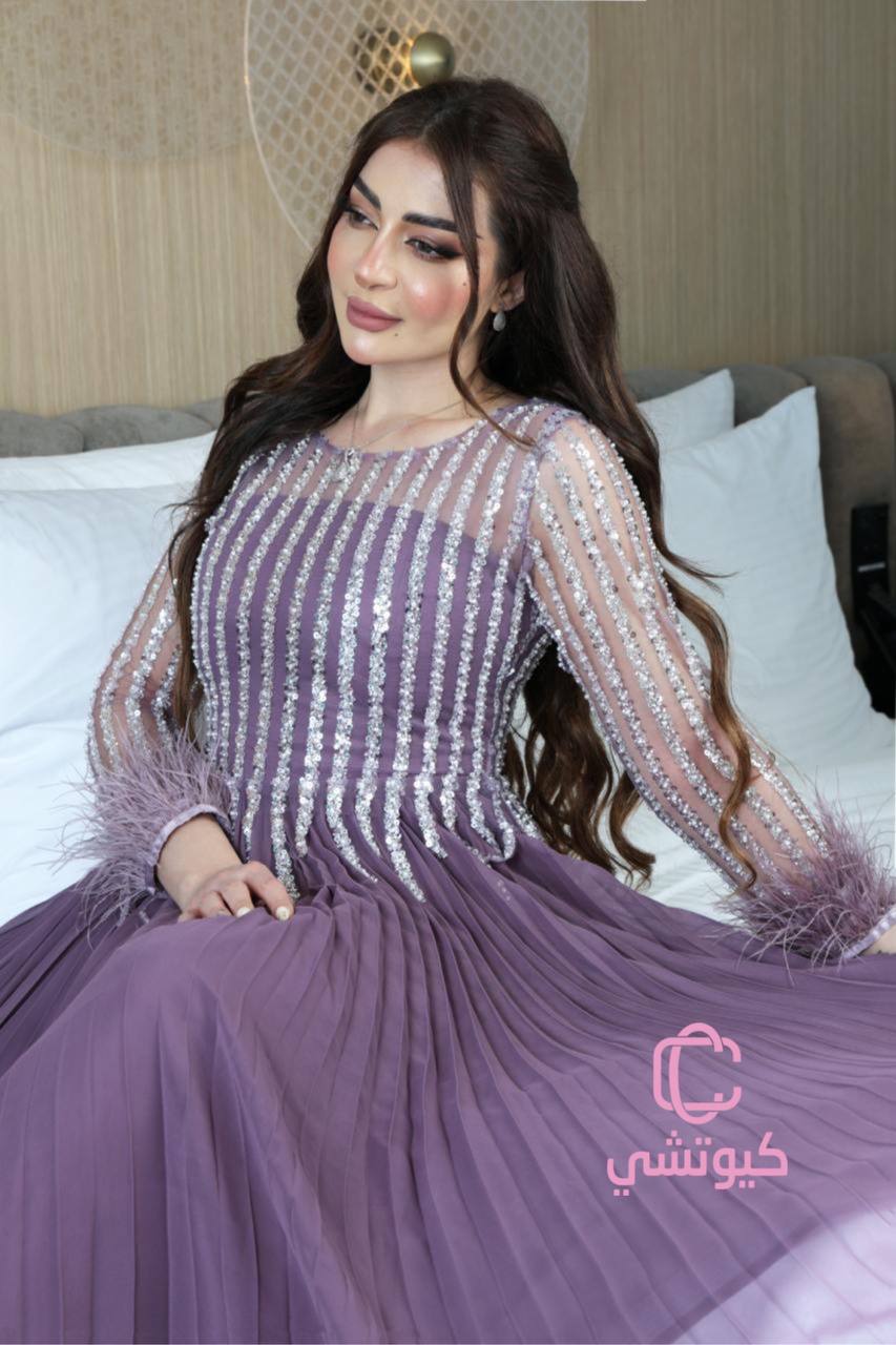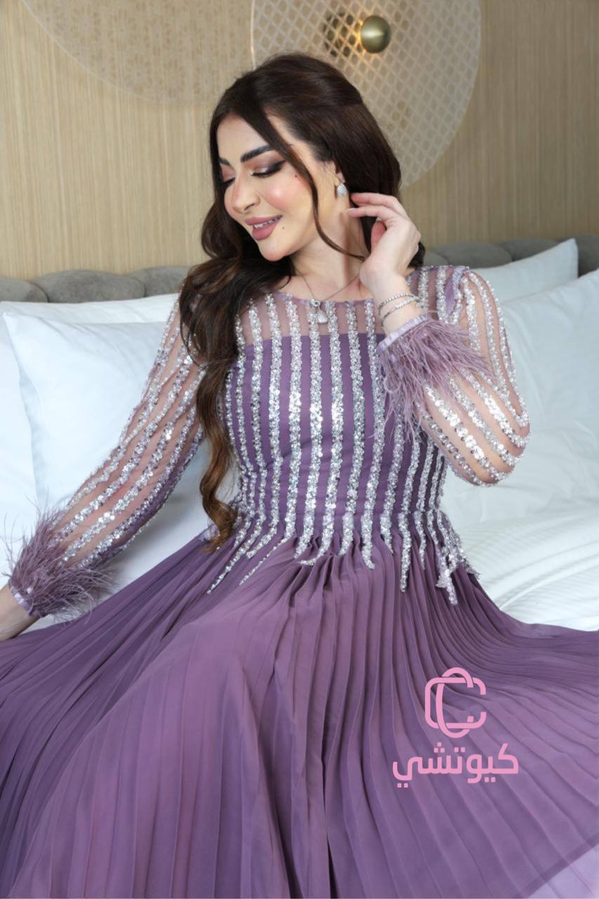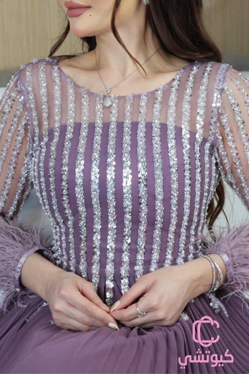 تصميم الصدر مزدان بخطوط لامعة من الترتر الفضي تضيف لمسة من الفخامة على فستان السهره الموف، بينما تمنح الأكمام الشفافة بطرفها المزخرف بالريش مظهرًا ناعمًا يخطف القلوب.