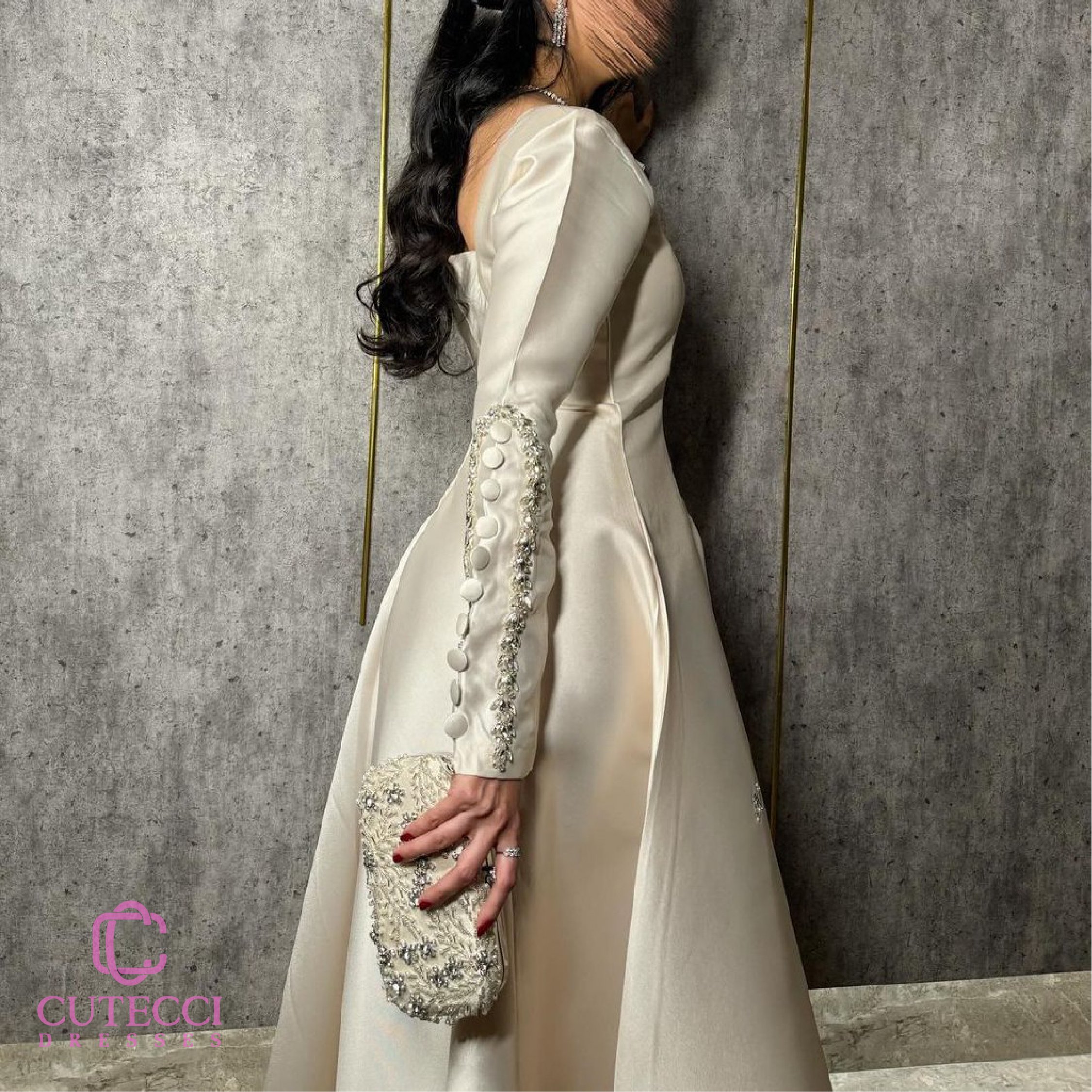- الرقبة والأكتاف والأكمام: ياقة مربعة أنثوية ناعمة، مع أكمام طويلة مطرزة بالكريستال والأزرار اللامعة لمزيد من التميز.