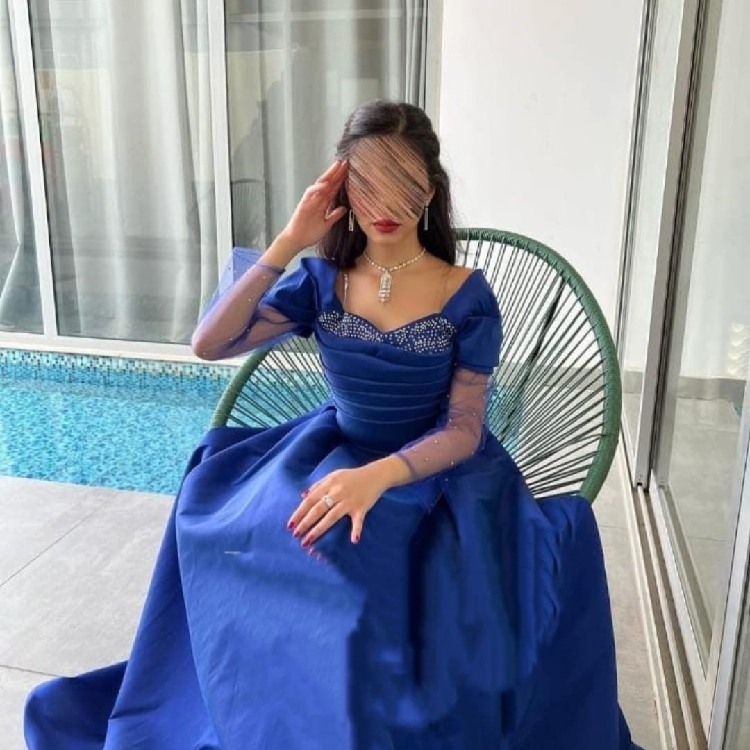 تألقي بإطلالة فاخرة مع فستان نيلي راقٍ بأكمام شفافة وتطريز فاخر من Cutecci يعكس فخامة التصميم وأناقة اللون.