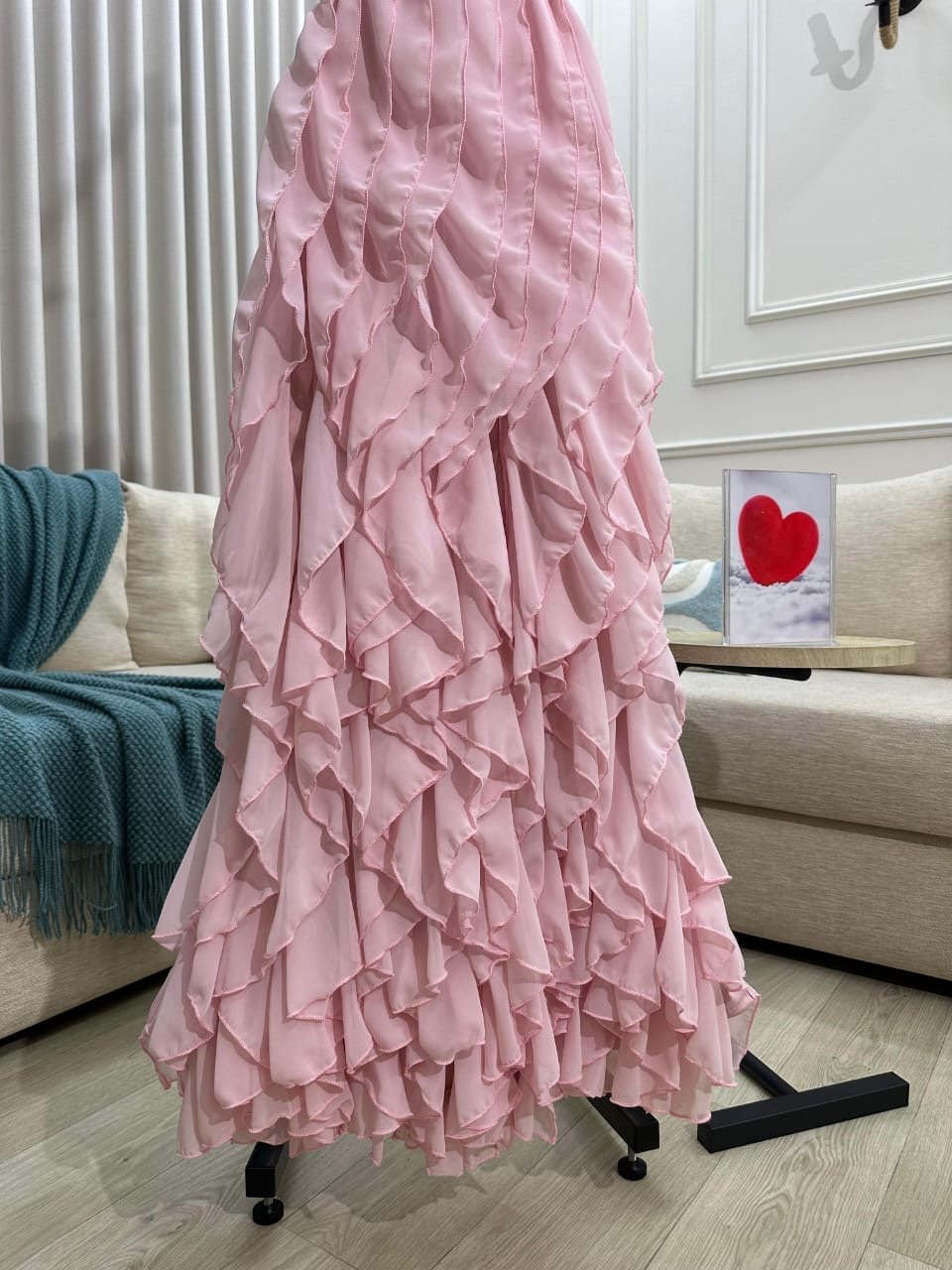 - التنورة والذيل: تنورة بطبقات كشكش انسيابية تمنح الفستان حركة خفيفة وأنثوية مثالية للحفلات.
