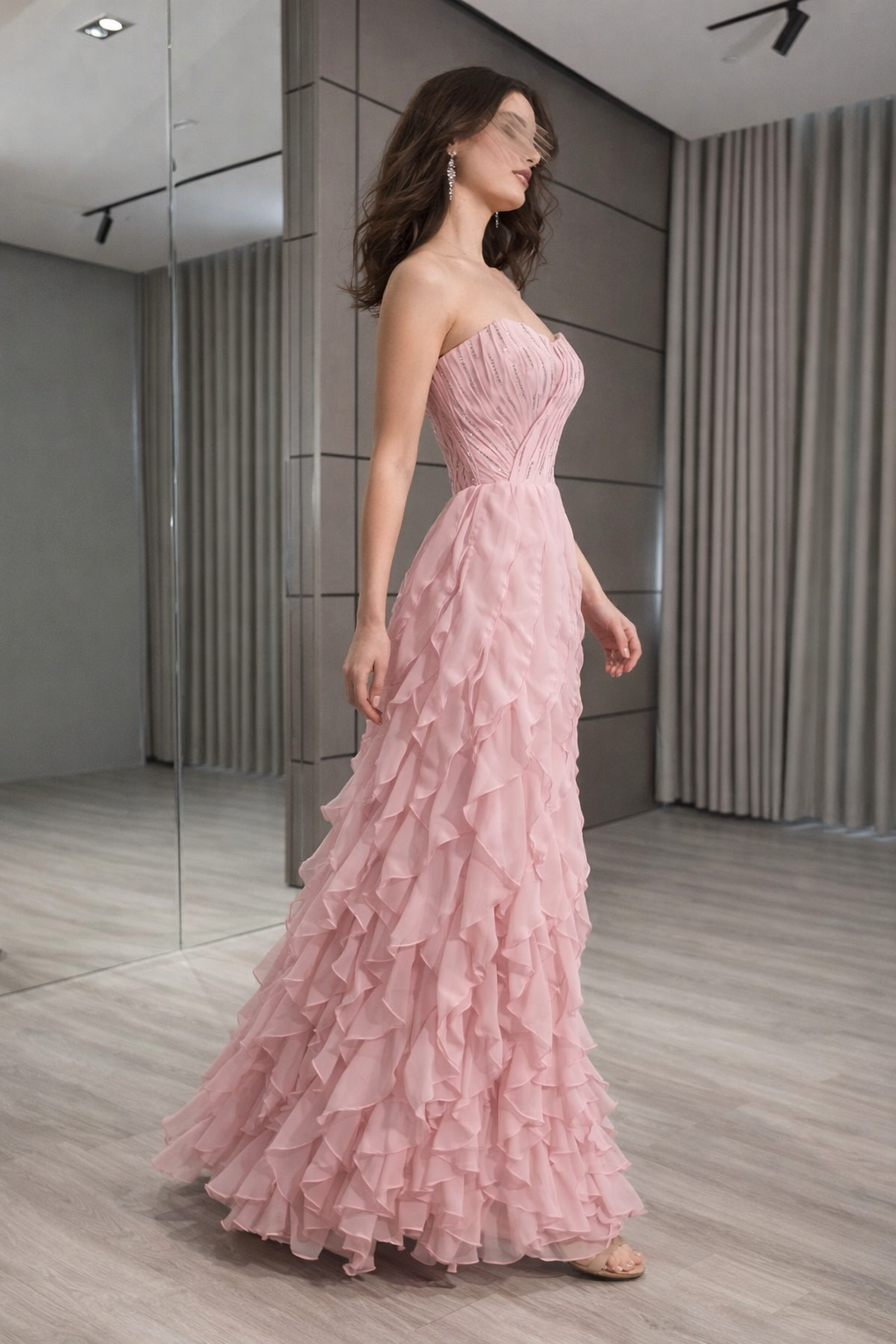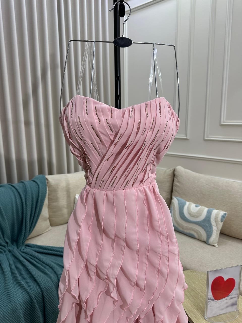 فستان وردي ناعم من قماش شيفون جورجيت مبطن يمنحك إطلالة أنثوية حالمة.